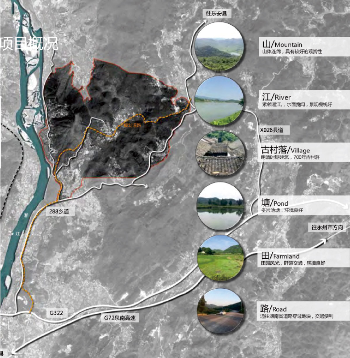 ? ? ?? 項目規(guī)劃總面積約8.3平方公里(約12415畝),主要由林田地、山丘與湘江水面組成,是以規(guī)劃區(qū)風(fēng)山體佇立,形成自然風(fēng)鵬金所面貌景觀,并有少量住宅用地、農(nóng)田用地和交通道路用地,自然生態(tài)環(huán)境較好,用地條件較好。