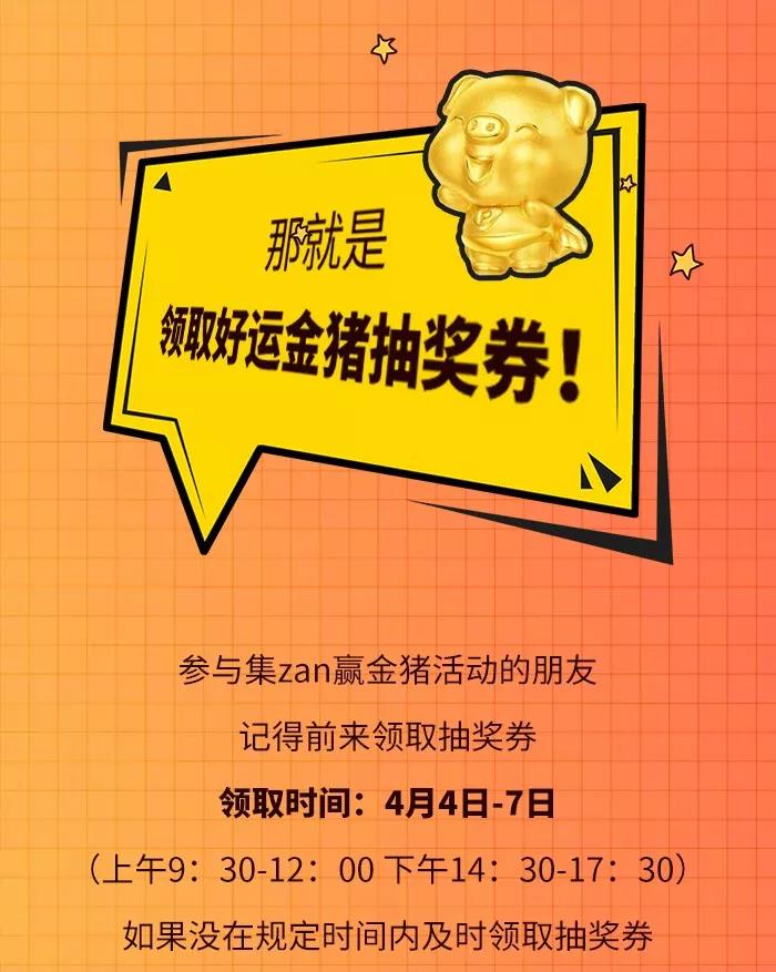 溫馨提示!4月4日-7日前來領(lǐng)取好運金豬抽獎券,周大福好運金豬帶回家!