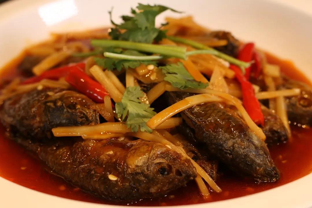 “禾花魚下酒,見者不走”,禾花魚因吃掉落在水中的稻花而得名。禾花魚體型粗短肥美,先將兩邊下鍋煎到金黃色,加入姜、豆豉、大蒜、新鮮辣椒或酸辣椒。禾花魚肉質肥美細膩,皮薄肉多刺少,魚肉的清香在口中徜徉,回味無窮。