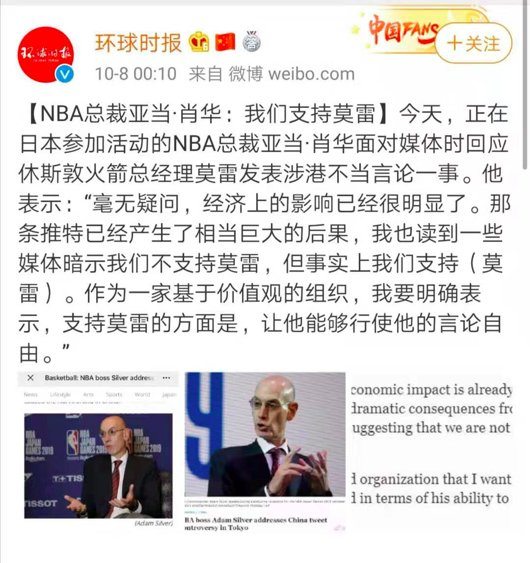 NBA總裁的這一回應(yīng),讓很多中國(guó)網(wǎng)友怒了,尤其是肖華所謂的“言論自由”——“支持莫雷的方面是,讓他能夠行使他的言論自由?!?