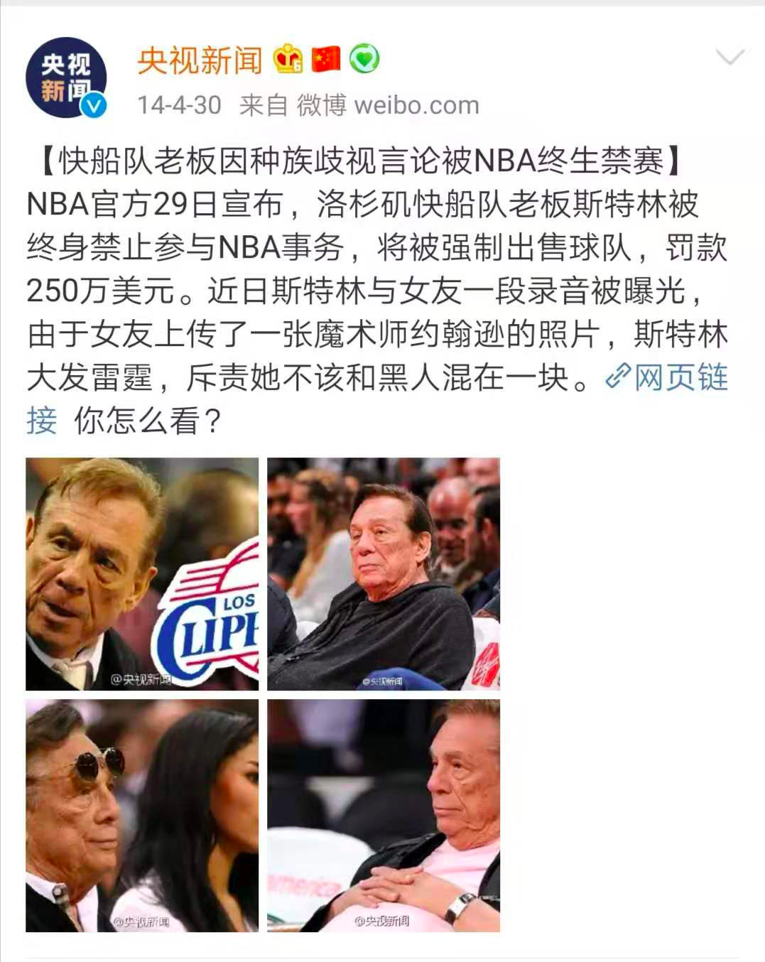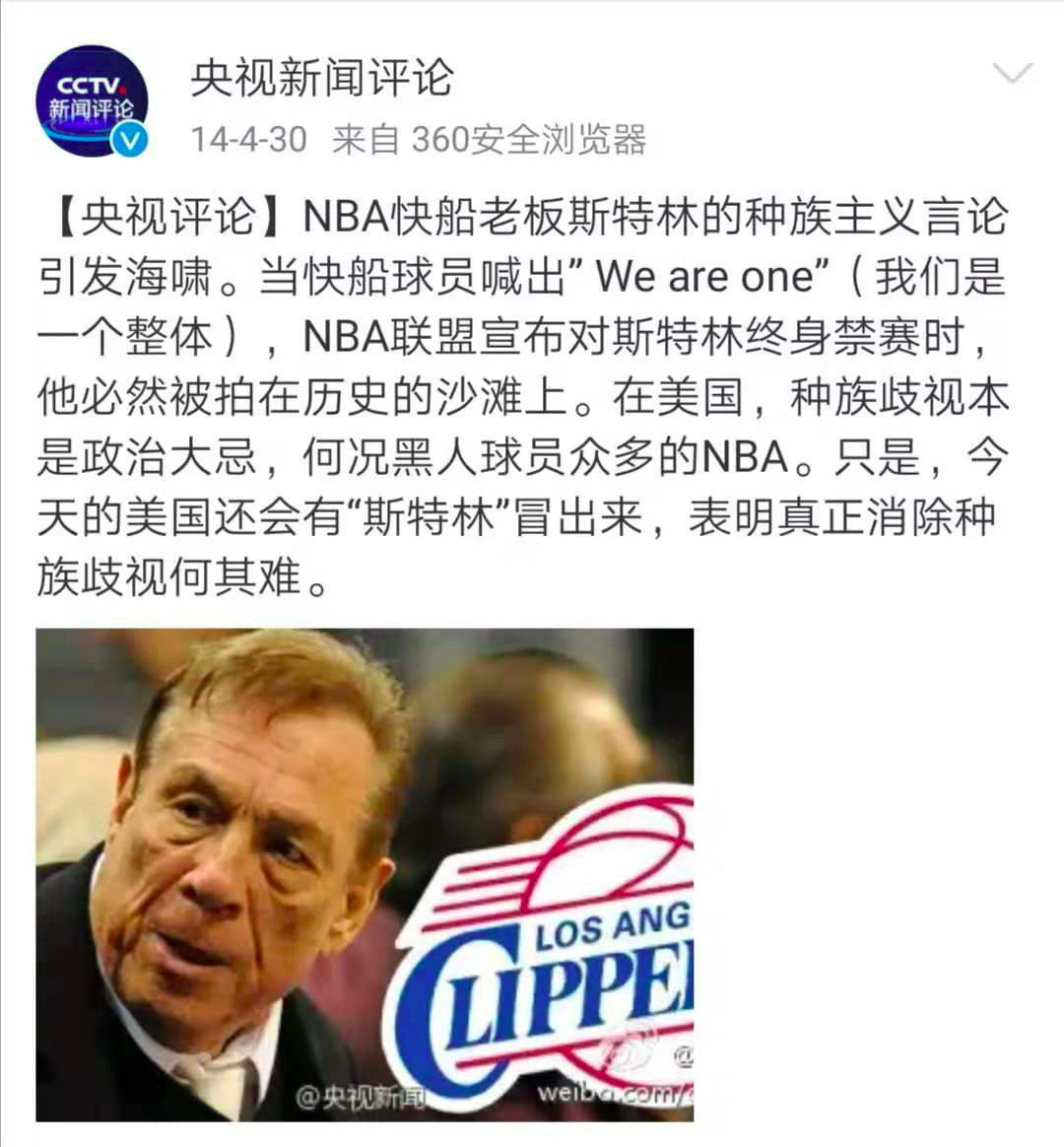2014年,當(dāng)時(shí)的快船隊(duì)老板斯特林與女友一段錄音被曝光,涉及種族歧視言論。