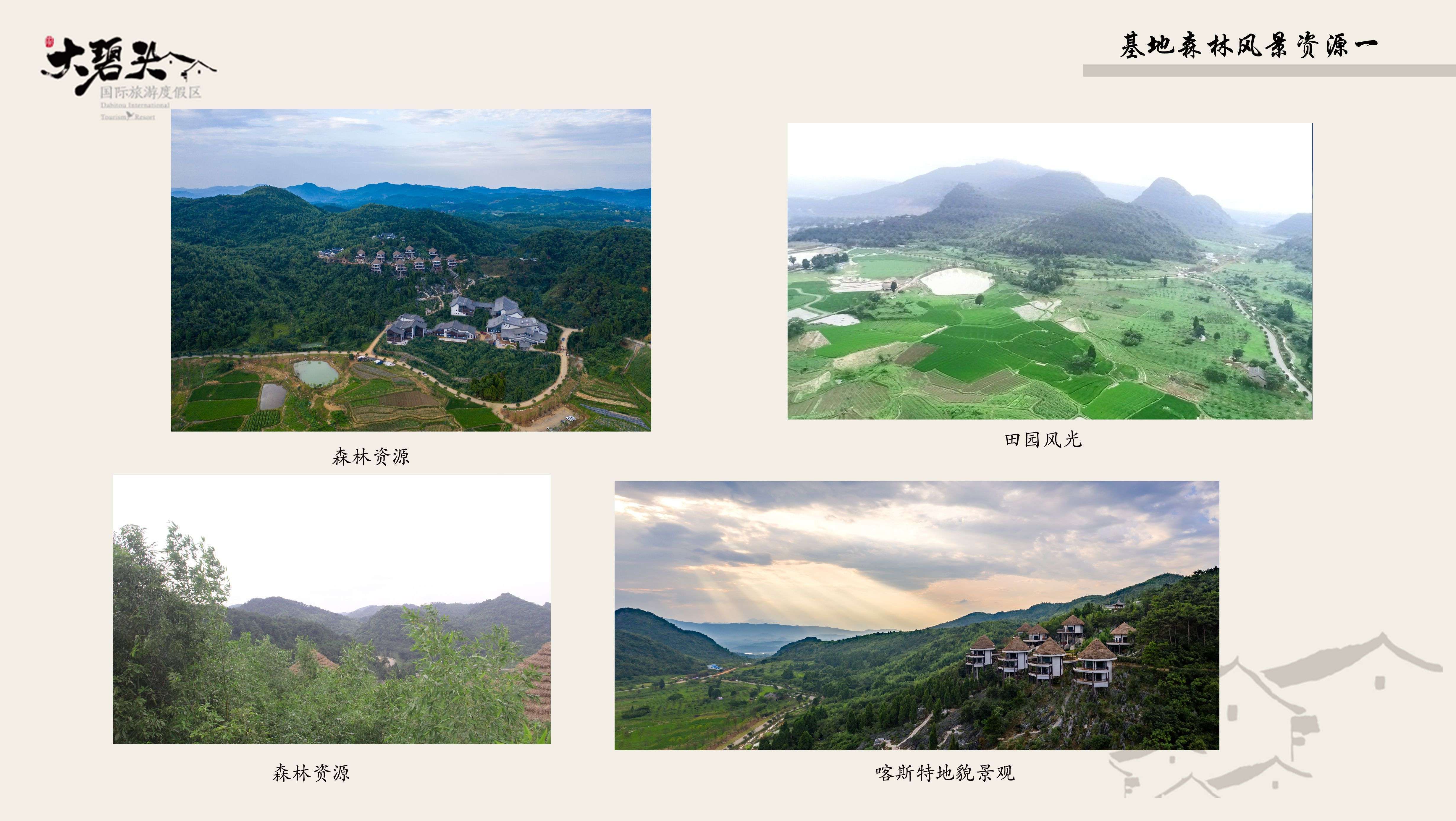 基地地貌屬喀斯特地貌,群山環(huán)繞,河道在峽谷間延伸,山間洼地、谷地交錯(cuò)分布。結(jié)合基地內(nèi)田園風(fēng)光、小盆地、古村落等,阡陌交錯(cuò),構(gòu)成了一幅林木青翠、田園牧歌、山水風(fēng)光、炊煙渺渺的景觀畫面。