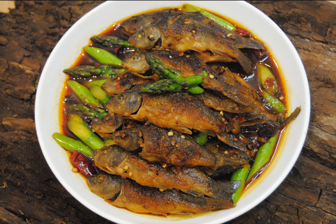 夏收之季盛也,取鮮魚以清水靜養(yǎng),使其吐盡泥沙。去苦膽,以鹽、姜絲、獨(dú)蒜、豆豉燉制,待其湯色乳白,魚體熟透,加以青紅椒絲、藿香、蔥花燒煮即可。其時(shí)也,湯開魚熟,滿屋飄香,味道鮮美,富含膠質(zhì),其食用多樣,尤以瓦罐煨煮,其味最佳?;虻枚D之,另有風(fēng)味,其成品金黃油亮,聞香生津,久食不膩。全州自古有諺云:"禾花魚下酒,見者不走。"魚出田時(shí),戶戶飄香,全州人古有"見者入席,喝酒吃魚"的習(xí)俗。"臘魚仔送飯,鼎鍋刮爛","炒魚肚貨,肚子脹破",其言實(shí)也。