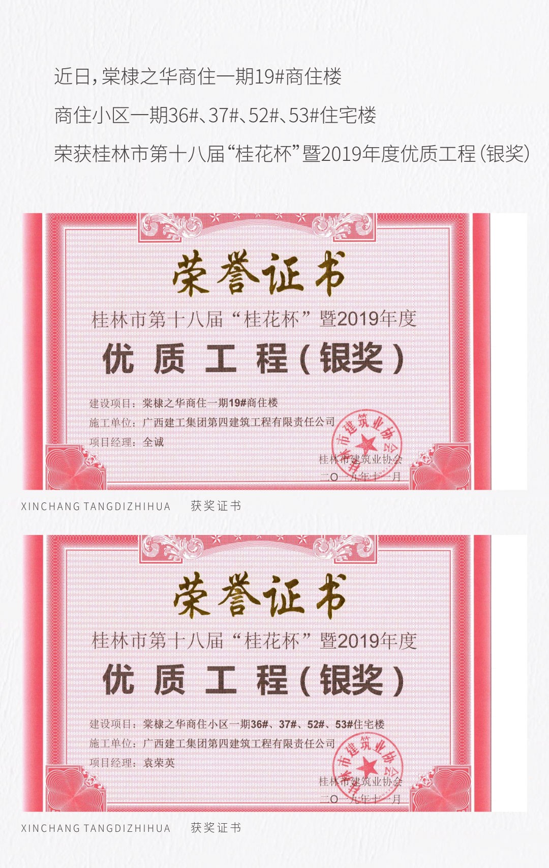 品質(zhì)源于責(zé)任,匠心鑄造精品!棠棣之華榮獲桂林市第十八屆“桂花杯”暨2019年度優(yōu)質(zhì)工程(銀獎)